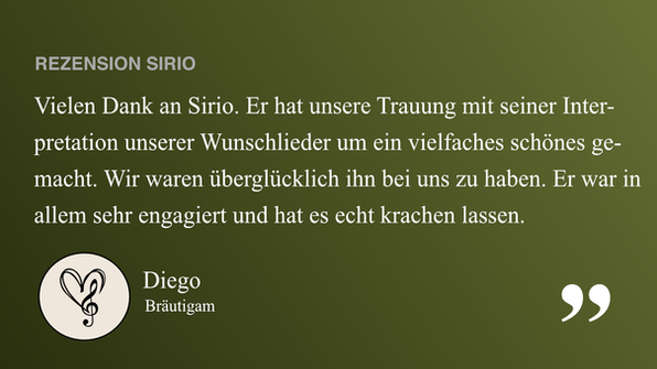 Ob bei einer zivilen, kirchlichen oder freien Trauung, beim Apéro, beim Dinner oder über den gesamten Hochzeitstag hinweg - Sirio sorgt stets für den passenden musikalischen Rahmen. Während der Zeremonie begleitet er die emotionalsten Momente mit Gefühl und Tiefe. Beim Apéro schafft er eine leichte und fröhliche Stimmung, und am Dinner verzaubert er mit Popsongs, die frisch und zugleich vertraut klingen. Sirio steht für Authentizität und das feine Gespür, jeden Moment mit Musik unvergesslich zu machen.